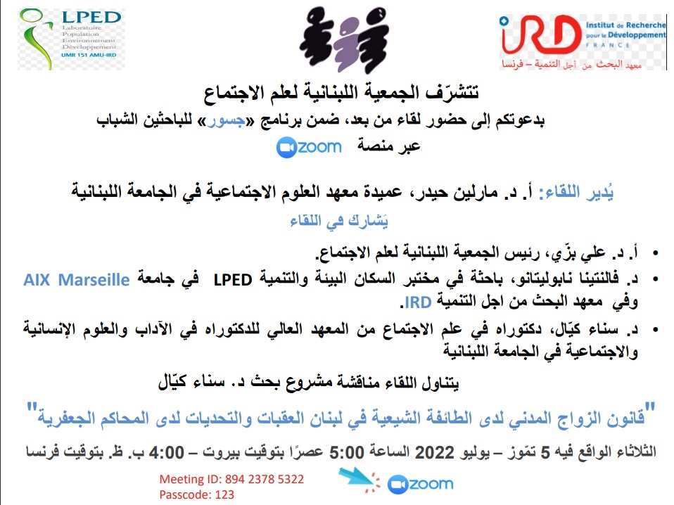 تتشرف الجمعية اللبنانية لعلم الاجتماع بدعوتكم لحضور اللقاء في برنامج جسور للباحثين الشباب رابط اللقاء